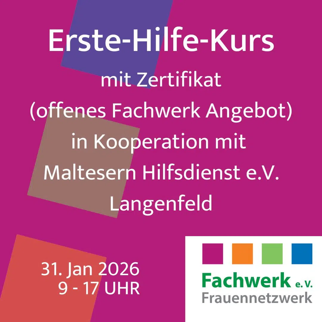 Karlstraße 3, 40764 Langenfeld Karlstraße 3, LangenfeldAm 31.1.2026 bieten wir auf wiederholte Anfrage das erste Mal einen Erste-Hilfe-Kurs an. Dies geschieht in Zusammenarbeit mit dem Malteser Hilfsdienst e.V. aus Langenfeld. Der Kurs wird für max. 15 Teilnehmende angeboten. Es ist ein offenes Angebot, d.h. sowohl Fachwerkerinnen als auch Interessierte aus der Region sind herzlich willkommen! Weitere Infos: Am Ende bekommen alle […]